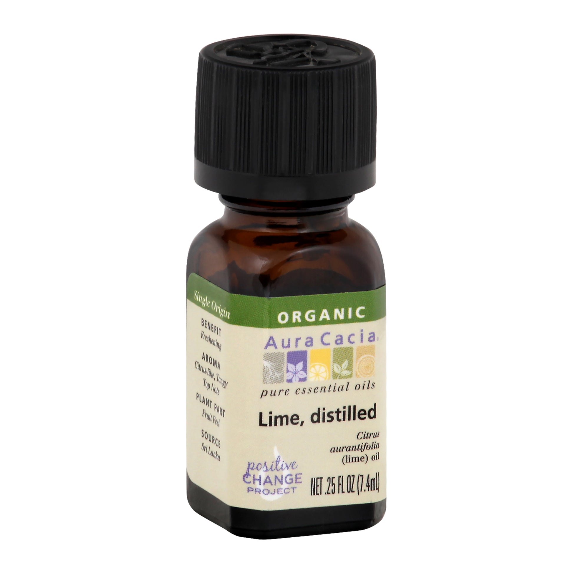 Citrus aurantifolia (lime) oil. USDA Organic. Certified Organic by QAI. 100% pure essential oil. Single origin. Benefit: Freshening. Aroma: Citrus-like, tangy, top note. Plant Part: Fruit peel. Source: Sri Lanka. Tested and verified for purity. Gas chromatography. www.auracacia.com. Positive Change project.