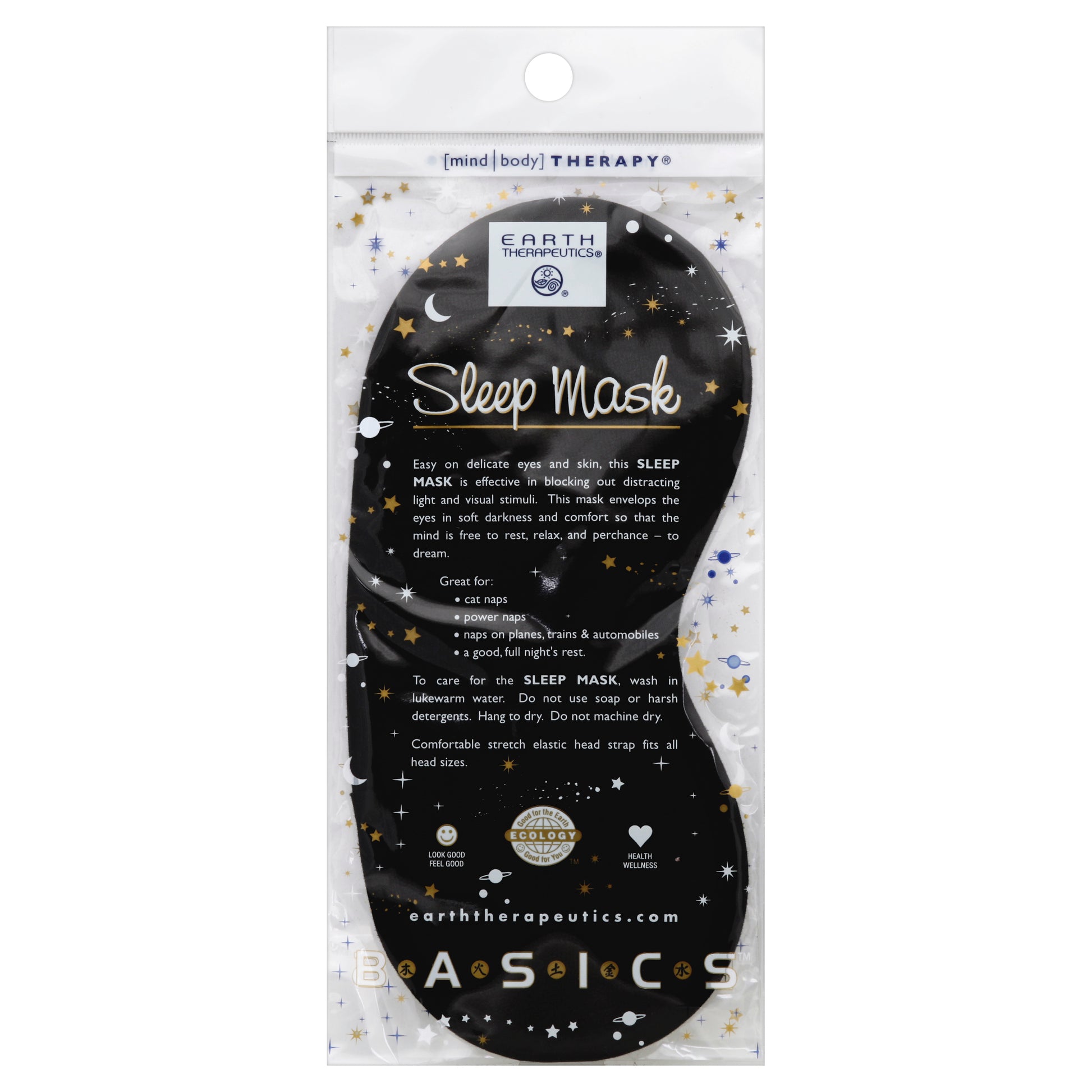 Easy on delicate eyes and skin, this sleep mask is effective in blocking out distracting light and visual stimuli. This mask envelops the eyes in soft darkness and comfort so that the mind is free to rest, relax, and perchance - to dream. Great for: cat naps; power naps; naps on planes, trains & automobiles; a good, full night's rest. Comfortable stretch elastic head strap fits all head sizes. Look good. Feel good. Ecology: good for the earth; good for you. Health. Wellness. earththerapeutics.com. Basics. 100% polyester fleece. Polyester trim. Product of China.