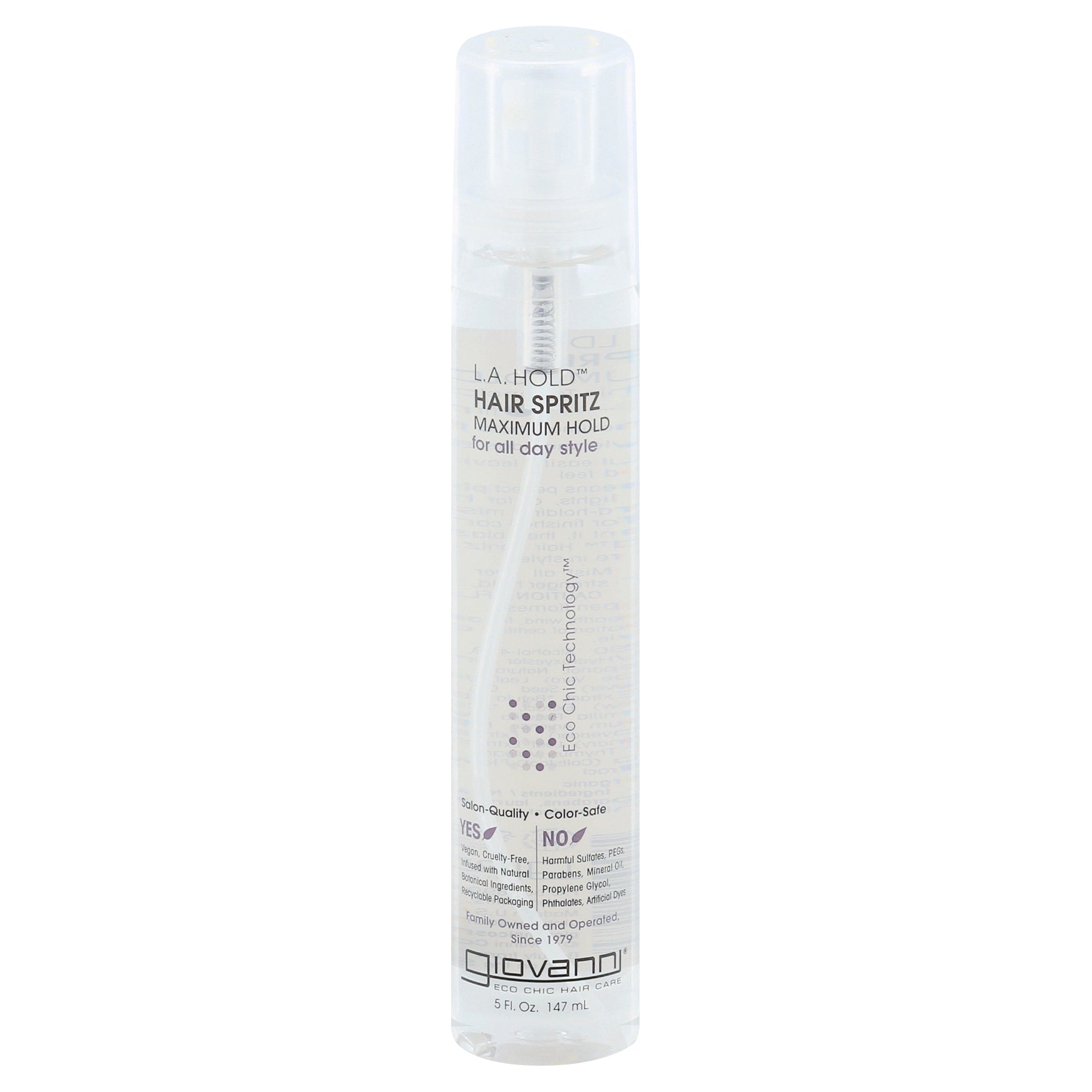Vegan. 100% vegetarian ingredients. For all day style. Eco Chic Technology. Salon-quality. Color-safe. Yes: Infused with natural botanical ingredients. No: Harmful sulfates, PEGs, parabens, mineral oil, propylene glycol, phthalates, artificial dyes. Family owned and operated. Since 1979. With Eco Chic Technology (The elements of earth, wind, fire and water represent a unique combination of certified organic botanicals and incredible style). Soft. firm. Provides maximum hold for style control. Retains style and adds shine. Washes out easily, leaving a conditioned feel. LA Hold means perfect placement. Great for under the lights, or for hot, hot nights. Spray this hard-holding mist all over your finished style for finished control. Move hair where you want it, then blast it into place. With LA Hold Hair Spritz, you're a star. So smile. You're in style. Family owned & operating. Since 1978. We do not add parabens, lauryl or laureth sulfate, dyes or PEGs to this product. Beauty from the elements is Chic on the Street. giovannicosmetics.com. Recyclable packaging. Please recycle. Cruelty-free. No animal testing. Made in USA from globally sourced materials.