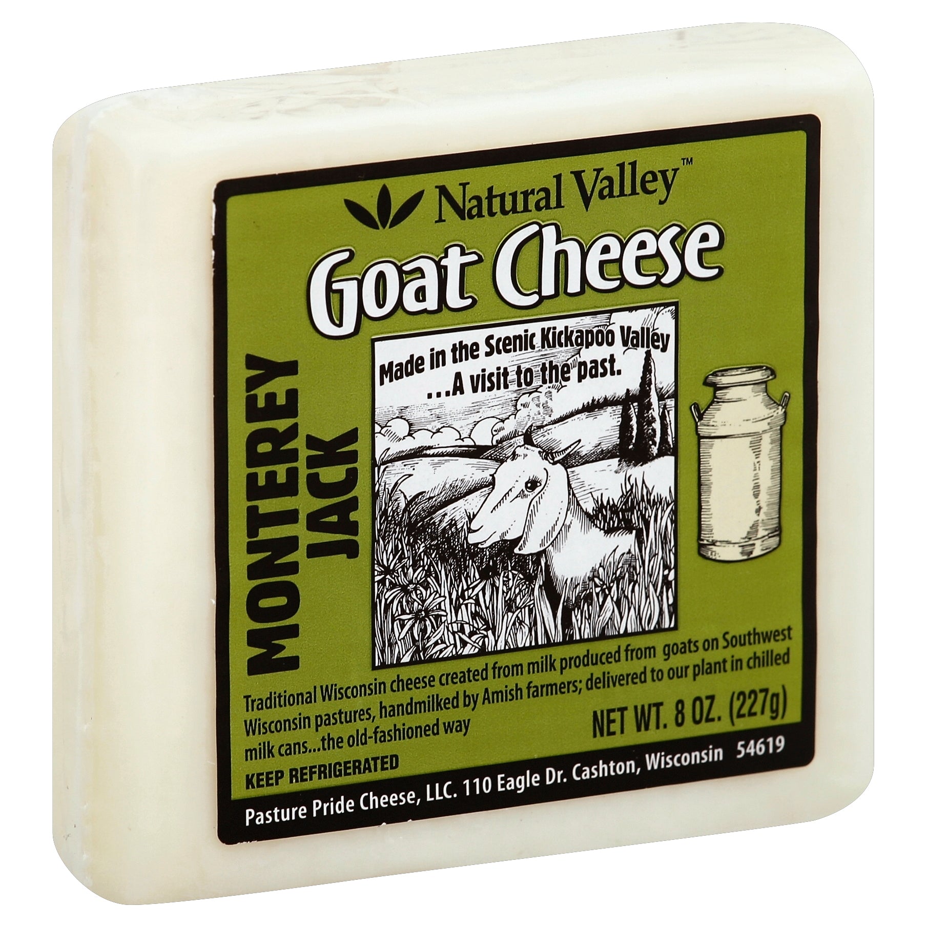 Traditional Wisconsin cheese created from milk produced from goats on Southwest Wisconsin pastures, handmilked by Amish farmers; delivered to our plant in chilled milk cans - the old-fashioned way. Made in the Scenic Kickapoo Valley - A visit to the past.