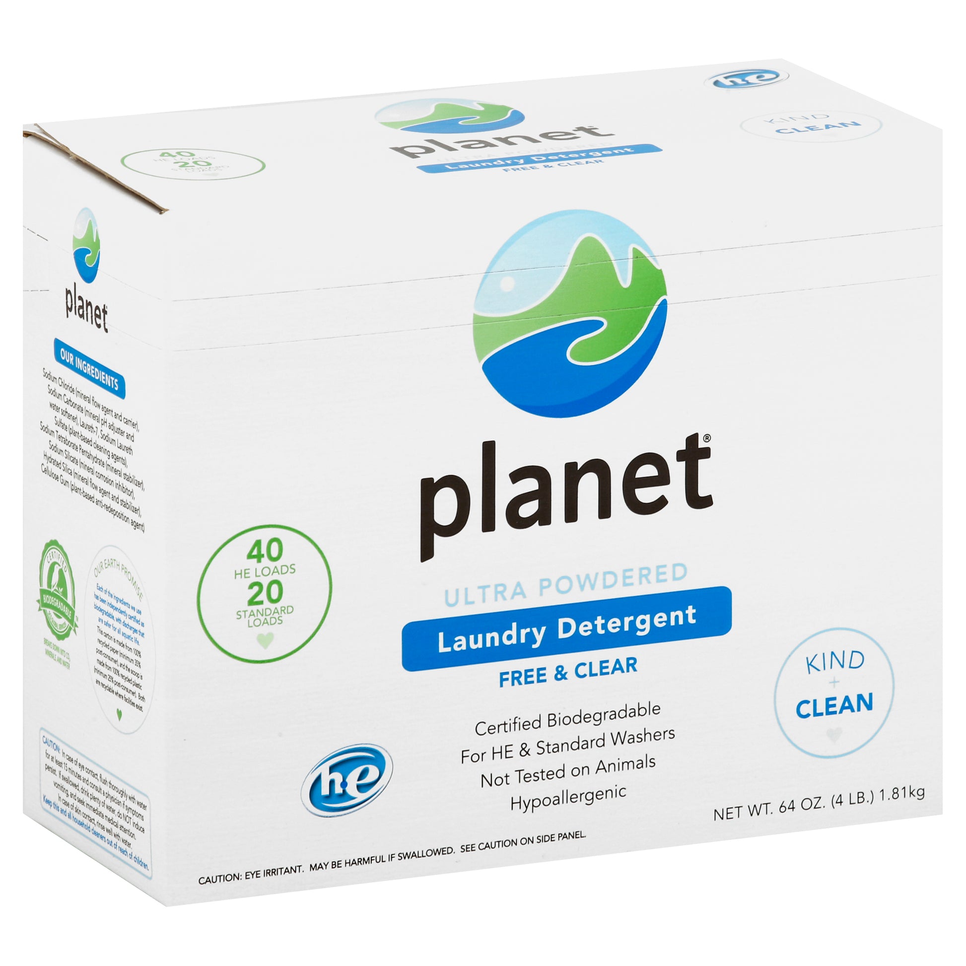 40 HE loads. 20 standard loads. Certified biodegradable. For HE & standard washers. Not tested on animals. Hypoallergenic. Kind + clean. Convenient reclosable lid. A hard-working detergent that really goes to work on your tough stains with a low-sudsing formula that is ideal for high-efficiency washers. Energy-Saving Tip: Did you know that up to 90% of the energy used to wash your clothes is used for heating the hot water? Washing in cold water significantly reduces your energy use and carbon footprint, which is good for the planet and saves you money! Washing in cold water is also gentler on your clothes. Planet Ultra Powdered Laundry Detergent is formulated to work in any water temperature, so consider switching to cold water for your laundry. For more information about this and our full range of Planet cleaning products and Green Forest paper products, visit: www.planetinc.com. Please recycle. Note: There may be some settling of contents during shipment. Be assured there is a full 64 oz in each box, which represents 20 regular wash loads (40 high-efficiency loads). Certified biodegradable SCS Global Services. Breaks down into CO2, minerals, and water. Our Earth Promise: Each of the ingredients we use has been independently certified as biodegradable, with discharges that are safer for all aquatic life. This carton is made from 100% recycled paper (minimum 35% post-consumer), and the scoop is made from 100% recycled plastic (minimum 25% post-consumer). Both are recyclable where facilities exist. Our Philosophy: At Planet, we believe that we all have a responsibility for the preservation of the earth. Planet is committed to the concept that companies must become part of the environmental solution, including recycling and reuse of materials, even if profits are a little lower as a result. We also feel strongly that companies should help fund the activities of non-profit organizations that focus all of their skills and energies on environmental issues. Planet makes annual donations to such groups, and has a special partnership with River Network. River Network: Connecting people, saving rivers. Contact Us: Your comments, questions, and suggestions are welcomed! Please write us at: Planet Inc. PO Box 48184, 3575 Douglas St. Victoria, British Columbia Canada V8Z 7H6. Or call us at: 1-800-858-8449. Or e-mail us. Or visit our website at: www.planetinc.com. Made in Canada.