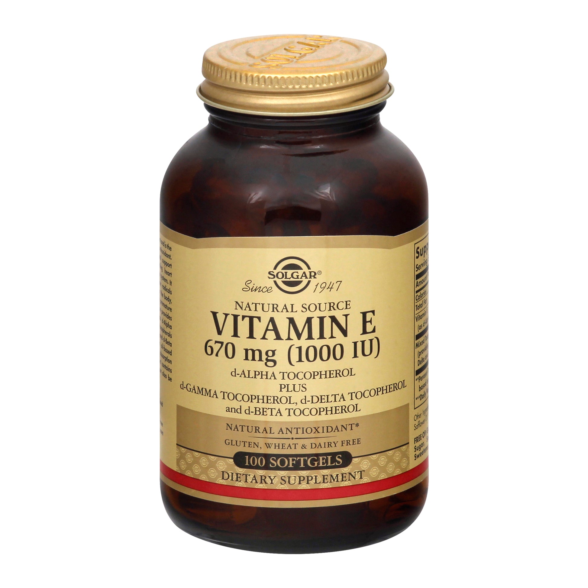 Dietary Supplement. Gluten, wheat & dairy free. Free of: gluten, wheat, dairy, yeast, sugar, sodium, artificial flavor, sweetener, preservatives and color. Non-GMO 1000 IU. Since 1947. Natural source. D-alpha tocopherol plus. D-gamma tocopherol, d-delta tocopherol and d-beta tocopherol. Natural antioxidant. Vitamin E is an essential nutrient and is the body's primary, fat-soluble antioxidant. Vitamin E provides nutritional support for the many cells, including heart muscle cells, and the immune system. It helps fight cell-damaging free radicals that cause oxidative stress in the body, which may contribute to the premature aging of cells. This formulation provides natural source Vitamin E as d-Alpha tocopherol, and mixed tocopherols including d-Gamma, d-Delta and d-Beta Tocopherols. It is offered in oil-based softgels to promote optimal absorption and assimilation. This product contains 670 mg of Vitamin E. This can also be measured as 1000 IU. www.solgar.com For more information, call toll-free 1-877-Solgar 4 (These statements have not been evaluated by the Food and Drug Administration. This product is not intended to diagnose, treat, cure or prevent any disease.)