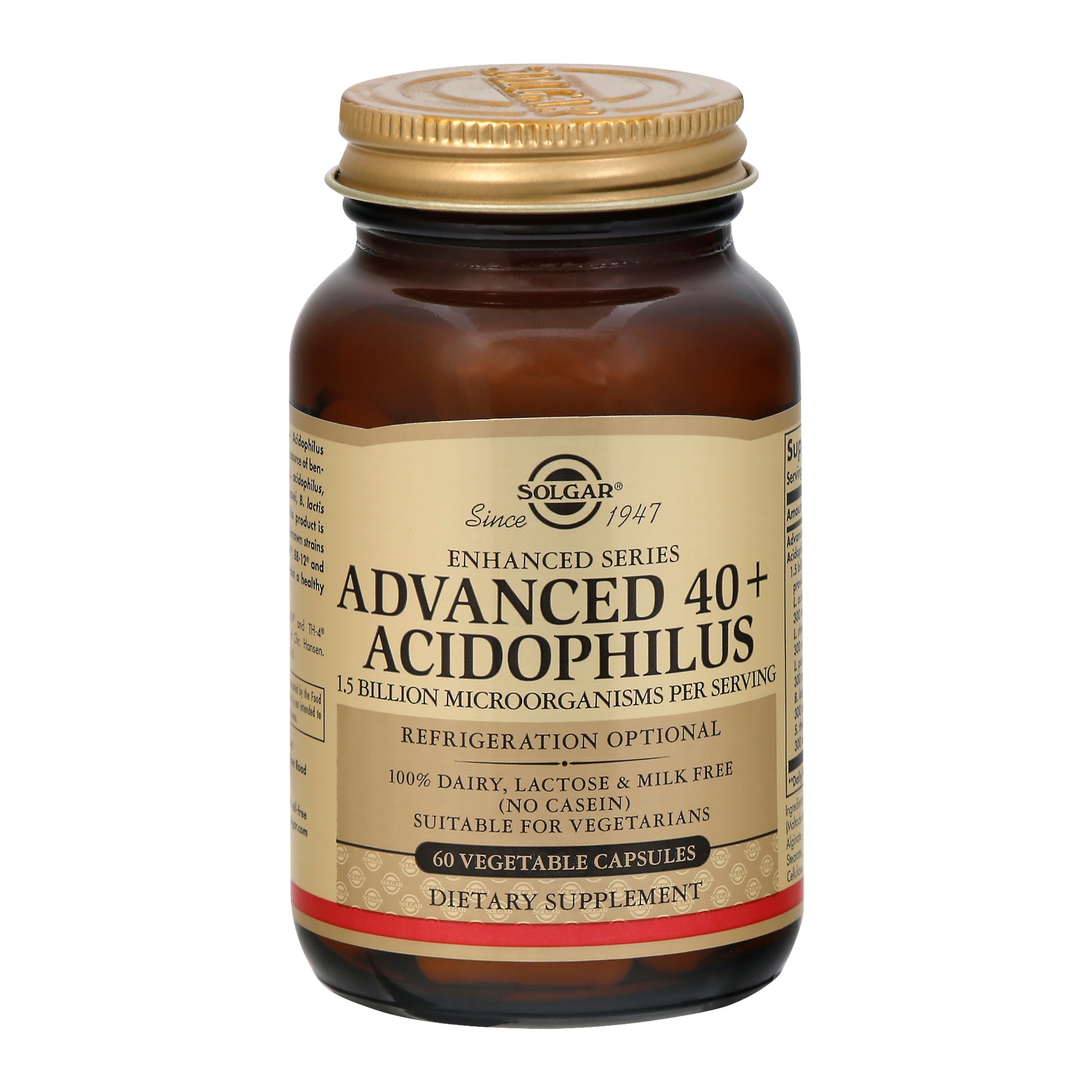 Dietary Supplement. 100% dairy, lactose & milk free (No casein). 1.5 billion microorganisms per serving. Since 1947. Enhanced series. Solgar Advanced 40+ Acidophilus Vegetable Capsules are a source of beneficial microorganisms L. acidophilus, L. rhamnosus, L. paracasei, B. lactis and S. thermophilus. This product is formulated with the well-known strains LA-5, LGG, L. casei 431, BB-12 and TH-4, helping to maintain a healthy intestinal flora. Contains no major allergens. Free of: gluten, wheat, dairy, soy, yeast, sugar, artificial flavor, sweetener, preservatives and color. www.solgar.com. For more information, call toll-free 1-877-Solgar 4, www.solgar.com. (These statements have not been evaluated by the Food and Drug Administration. This product is not intended to diagnose, treat, cure or prevent any disease.)