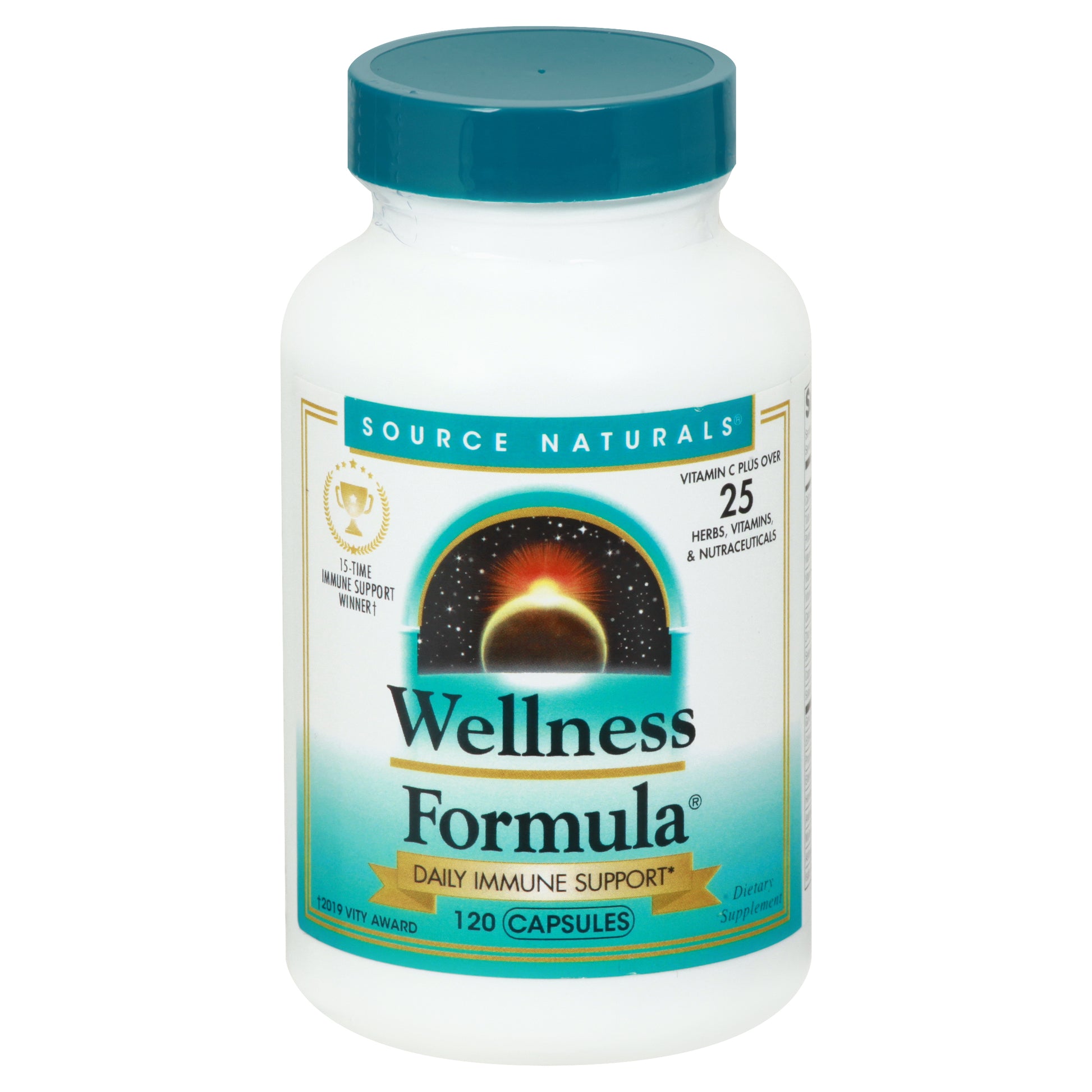Dietary Supplement. Vitamin C plus over 25 herbs, vitamins & nutraceuticals. Daily immune support. Wellness Formula delivers high-potency vitamin C plus more than 25 other vitamins, minerals, and time-tested traditional herbs to support immune health. www.sourcenaturals.com. 15-Time Immune Support winner (2019 Vity award). (These statement has not been evaluated by the Food and Drug Administration. This product is not intended to diagnose, treat, cure, or prevent any disease.)